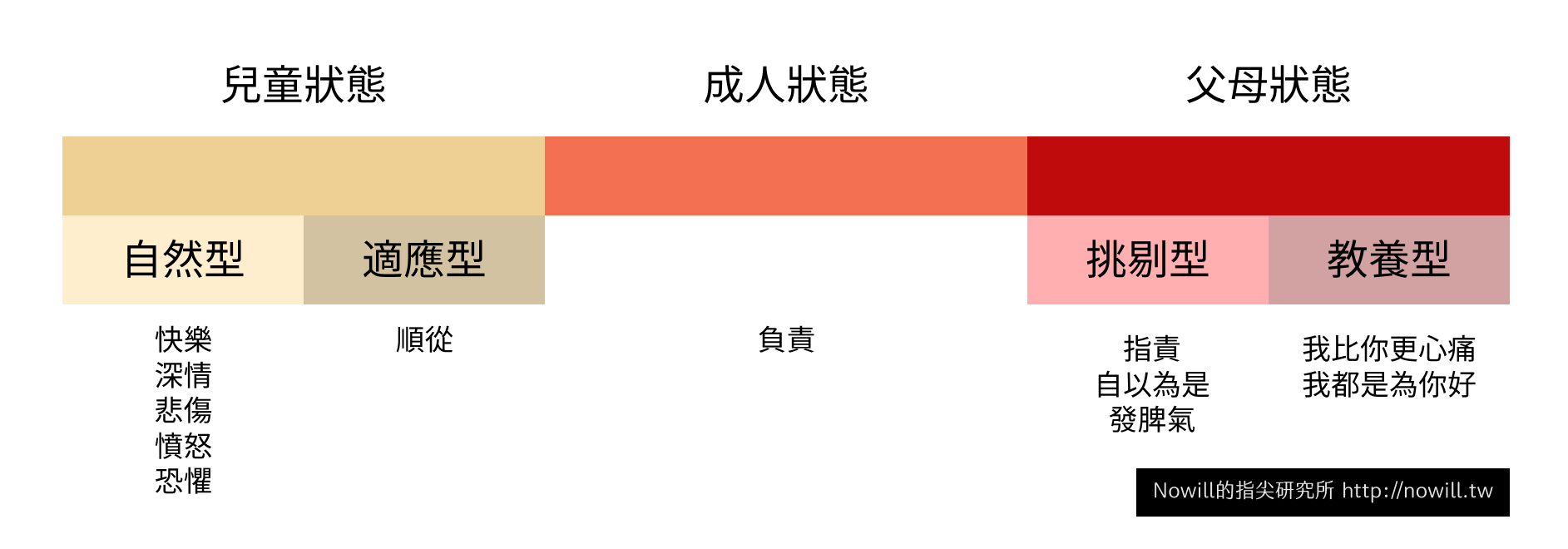 在兒童狀態的自然型中,我們會有的基本情緒,像是:快樂、深情、悲傷、憤怒、恐懼等等,當我們開始是適應大人的命令以後,我們就學會了順從。而在父母狀態下的我們,很容易用憤怒的態度去指責別人,讓自己處於以為「自己都是對的」的自以為是心理,使得我們變得容易酸言酸語,聽不下任何人的言語,甚至開始告訴他人是對方不懂你的用心。